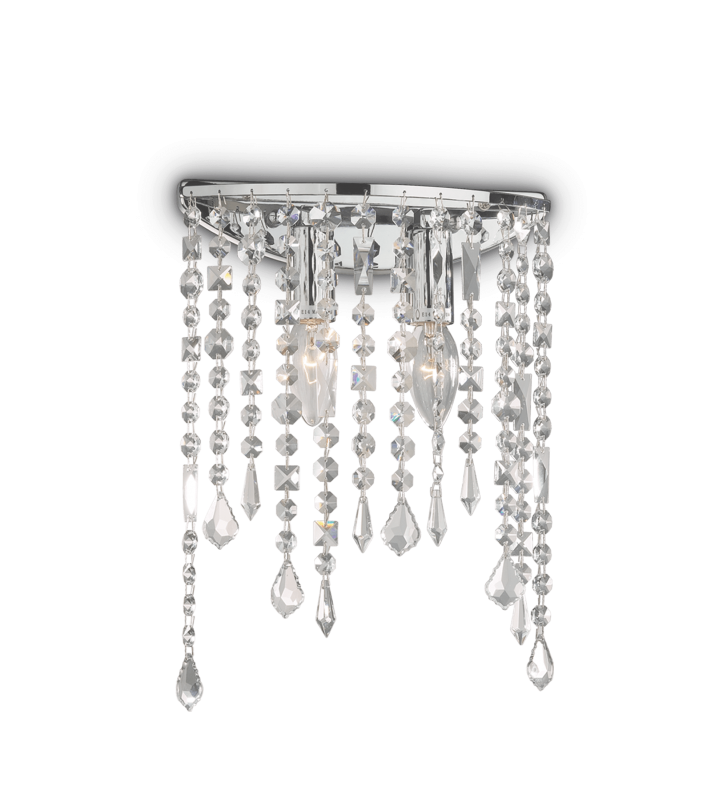 Aplica cu design elegant, sofisticat cu abajur din material textil alb, cristale decorative si cadru metalic argintiu